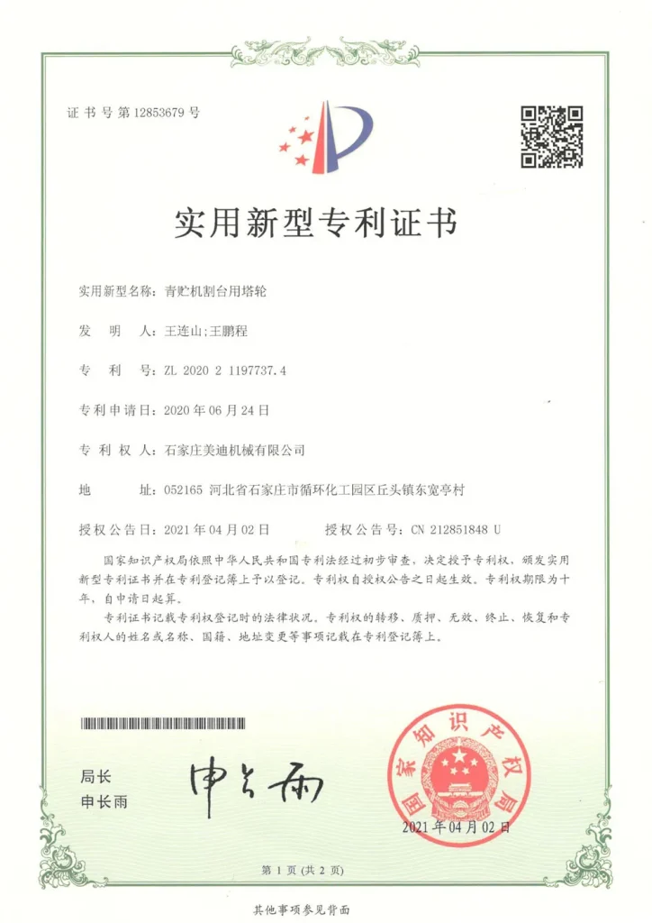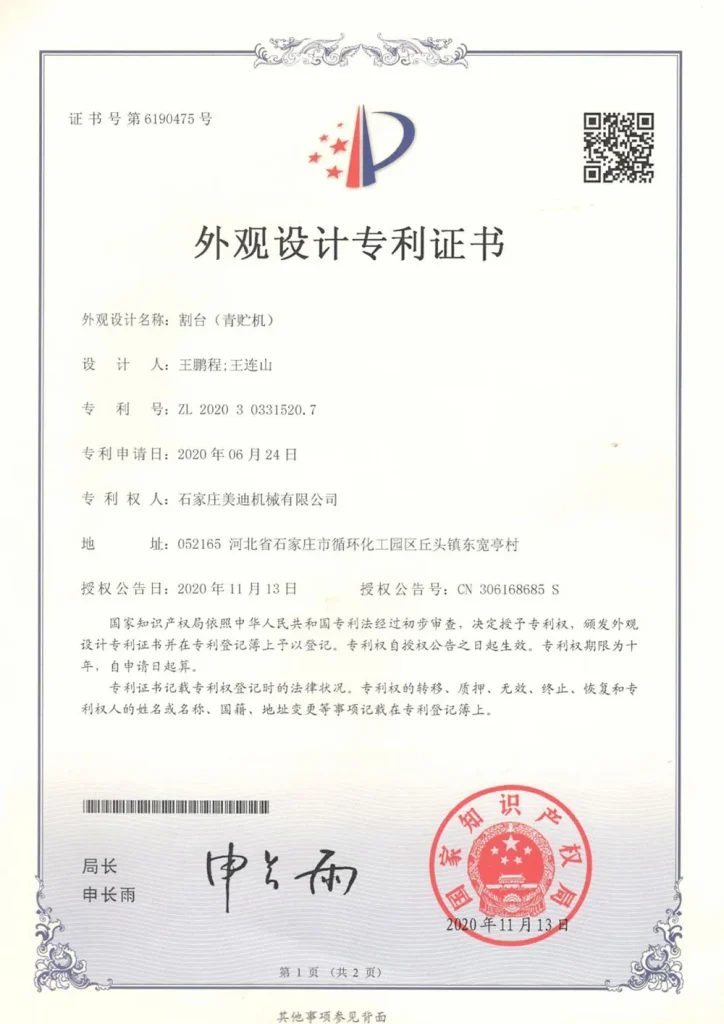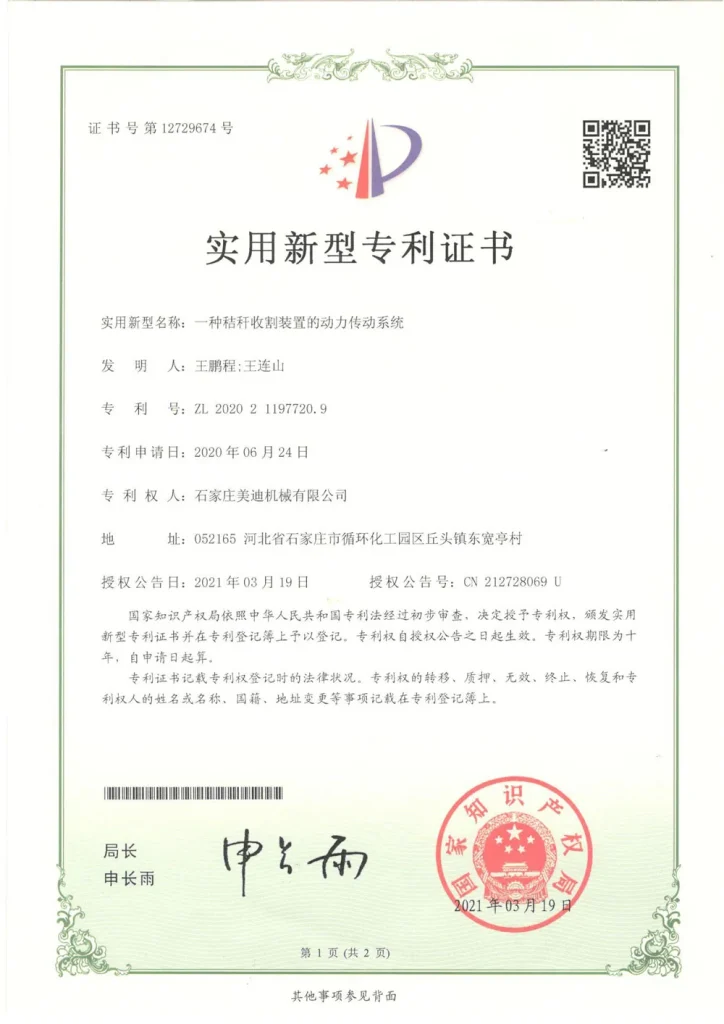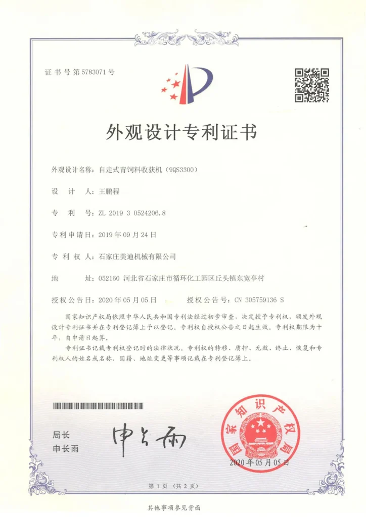 Кроме того, с момента своего основания Meidi всегда сосредотачивалась на самостоятельных научно-исследовательских разработках ключевых технологий. В последние годы наша компания добилась прорывов в области разработки силосоуборочных комбайнов в таких аспектах, как гидростатический привод хода, измельчитель зёрен кукурузы, электрогидравлическая система управления и уборочная жатка. Результаты исследований прошли практическую проверку и получили признание клиентов, и в настоящее время находятся на лидирующем в отрасли уровне.